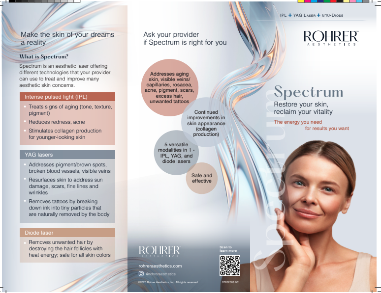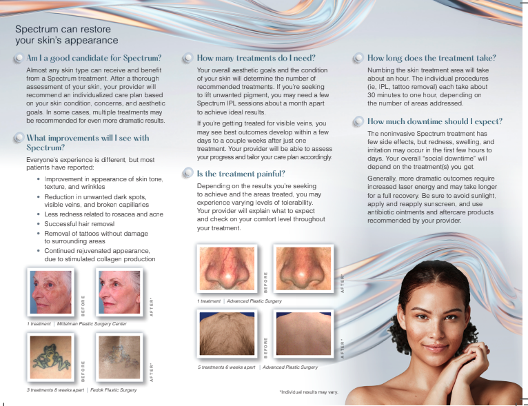 Handpieces: IPL (dark spots, acne, spider veins), Q-Switch (tattoo, deeper pigment), 810 Diode (hair), Erbium:YAG (full or fractional resurfacing).
